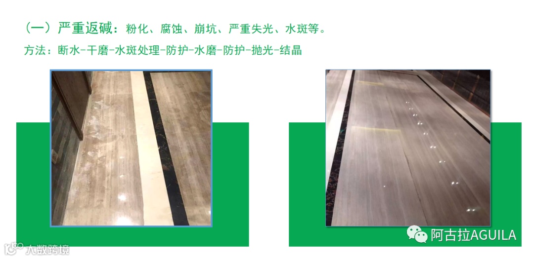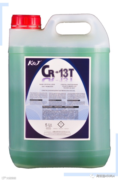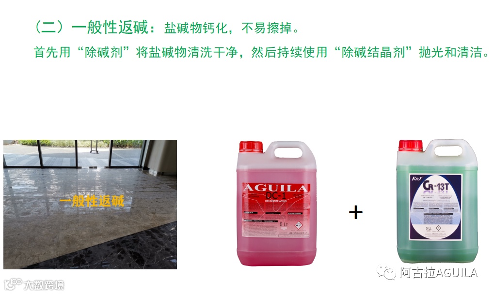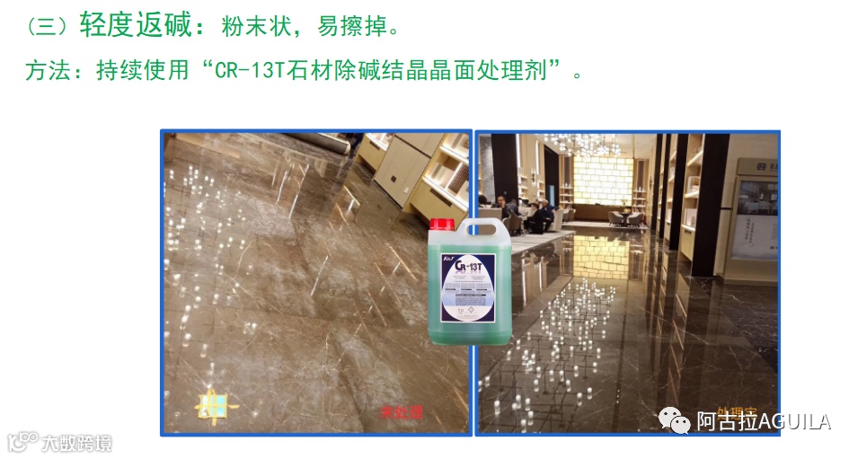 阿古拉CR-13T是专门针对大理石返碱而研制的结晶剂,能有效清除石材表面的盐碱物和石灰渍,并能抑制石材返碱,延长石材返碱周期,同时对石材也有结晶的作用。由于大理石返碱的程度是不一样的,同时受到环境和空气湿度的影响,CR-13T所呈现的返碱治理效果也是有差异的。在楼层和远离潮湿区的地方(例如:卫生间、茶水间),呈现的效果会快些;在首层、负层(接地气的地方)和潮湿区,呈现效果会慢些,治理周期会长些。如果在治理返碱阶段,开启空调、抽气和抽湿系统,有利于石材的水气散发,降低石材的湿度,对于治理返碱可起到事半功倍的效果。通常我们在治理返碱初期,药剂打磨的频次要多些,每隔2~3天就要打磨一次,到了中后期随着返碱的时间逐步延长,返碱的面积逐步缩小,时间可延长至7~10天打磨一次。如此持续一个月之后,我们就可以看到明显的效果,治愈率可达到90%以上。