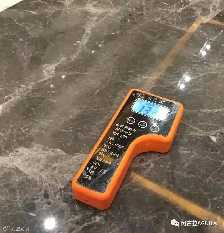 第二,在石材的含水率较高的情况下(8%以上),使用填缝剂、云石胶或者防护剂封堵石材的缝隙和毛细孔。为了使石材里面的水气尽快散发,我们通常会用切缝机将接缝处的云石胶切开,用粗磨片将石材表面打磨掉(工程术语叫“粗开”),用红外线灯箱烘烤。但有些施工方为了缩短工期,在石材没有干燥的情况下就急于将石材密封起来,由于石材还处于潮湿状态,这样既影响了胶的粘接性以及防护剂的渗透和固化效果,使返碱治理的效果大打折扣,甚至引发石材黄变、霉斑等次生问题。