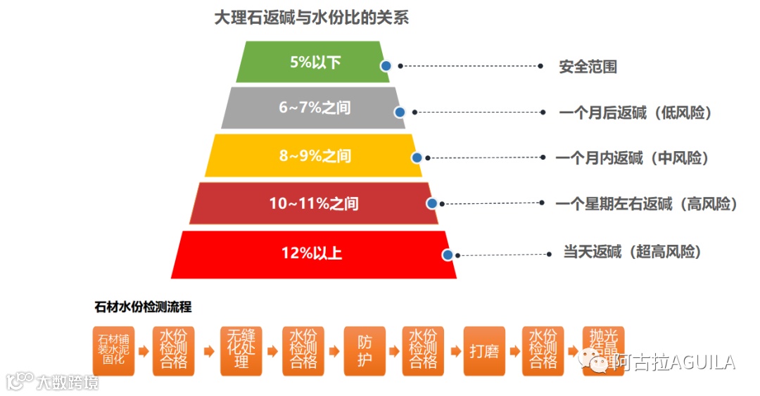 第五,以为这次把返碱问题解决,就一劳永逸了。由于返碱的成因很多且非常复杂,并非所有的返碱治理都做到100%成功,即使在现阶段经治理后的大理石不返碱,但如果日后由于清洁和保养不当,造成大理石再出现返碱,也是常有的事情。另外,当石材的湿度到了一定程度,再出现返碱也是完全可能的。在南方到了梅雨季节,哪怕是平常不返碱的石材到了这时候也会出现返碱。