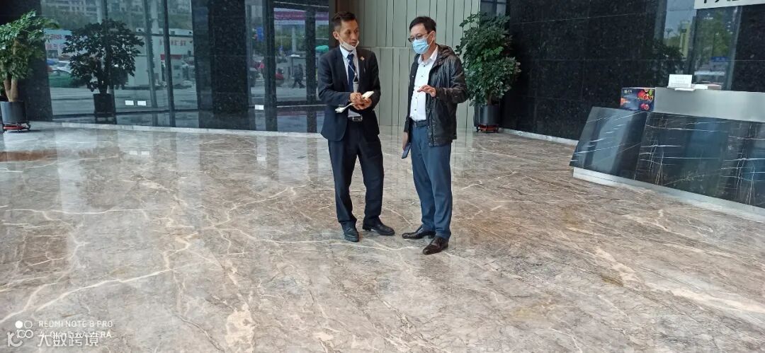 上午考察组一行人前往了中天物业的各个场地,指出了在石材保养方面所存在的问题,并提出具体的改进建议,陈总当即表示:将联合当地代理商,全力以赴帮助中天物业提升石材护理水平,成为当地在石材护理方面的标杆企业。