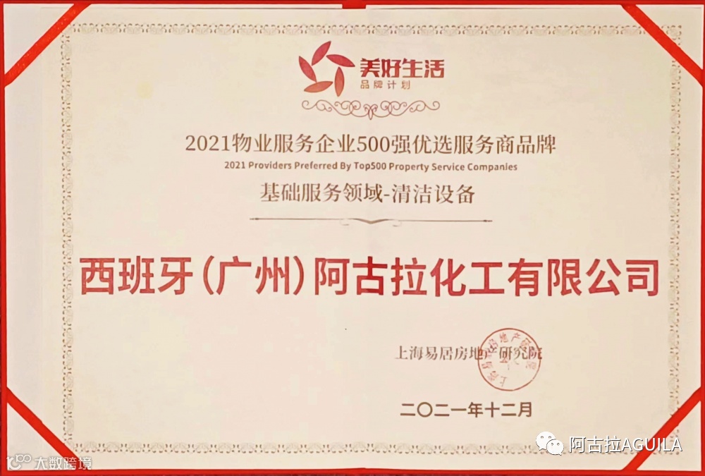 阿古拉荣获“2021物业服务企业500强优选服务商品牌 基础服务领域—清洁设备”奖!
