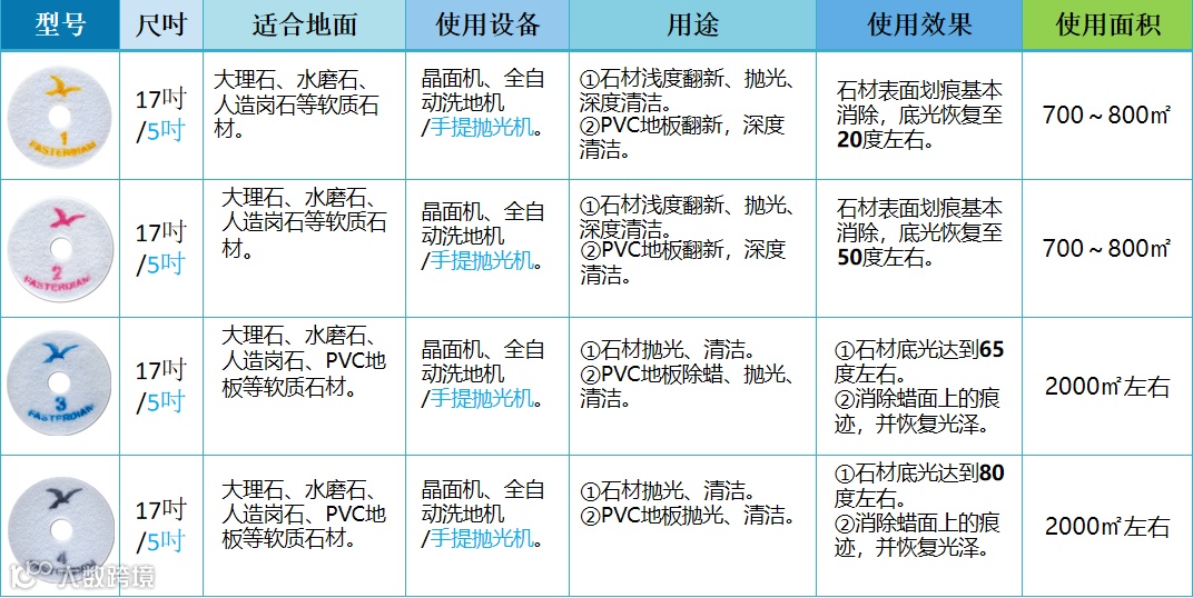 浅度翻新垫规格尺寸比磨片大,浅度翻新和抛光的速度更快,光泽度更细腻,操作起来更简单快捷,不易在石材表面留下磨痕,并且可使用全自动洗地机打磨、抛光、清洁,一气呵成。还可以用于PVC和胶地板。