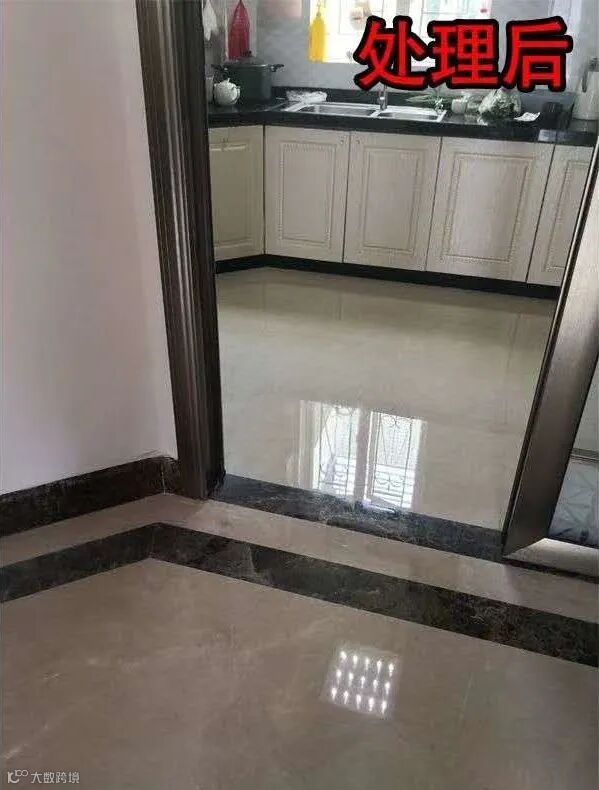 众所周知,由于油污、水渍等这些原因使餐厅和卫生间地面需要频繁地清洁,从而导致这些区域的大理石地面磨损和退光较快,是石材保养的难点和重点。以往我们要将地面清洁干净后,并让地面充分干燥后(至少3个小时以上),才可以进行抛光、晶面处理。现在这套工艺将大理石地面的清洁、抛光和晶面处理融合一起同步进行,极大地提高了工作效率,同时通过浅翻垫的抛光进一步提升了石材的底光,并采用了超强纳米耐磨材料结晶,使大理石晶面层的耐磨性提高了数倍,从而大大延长了石材的保养周期。