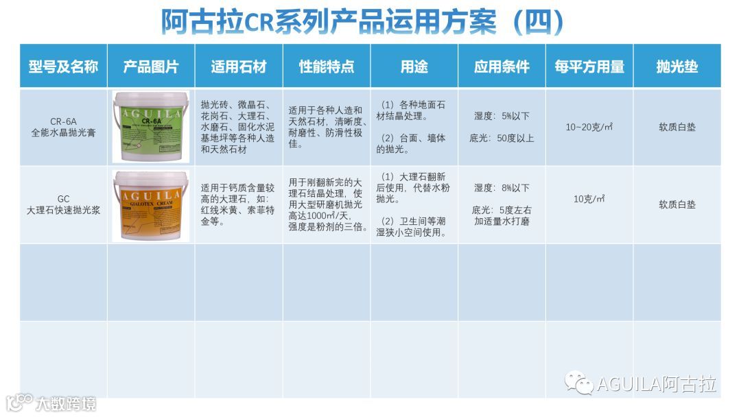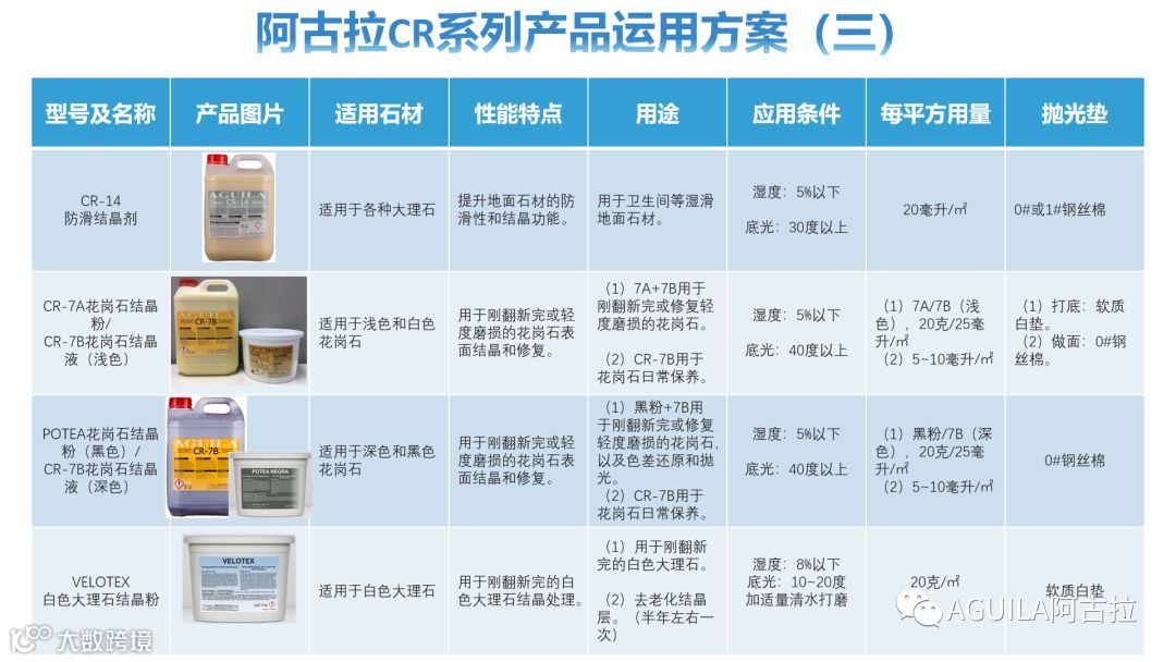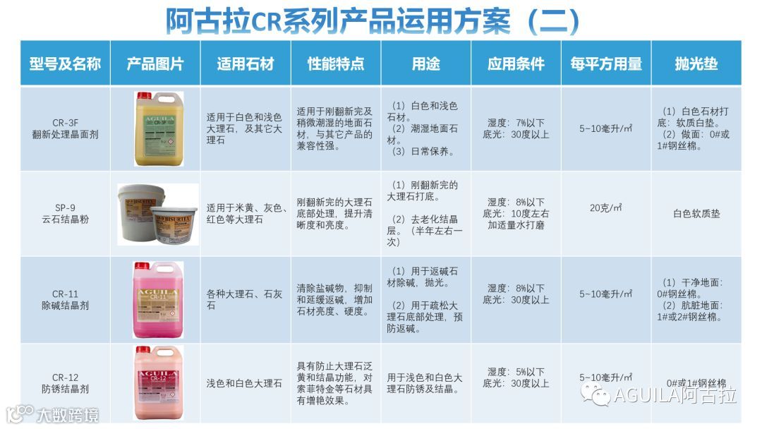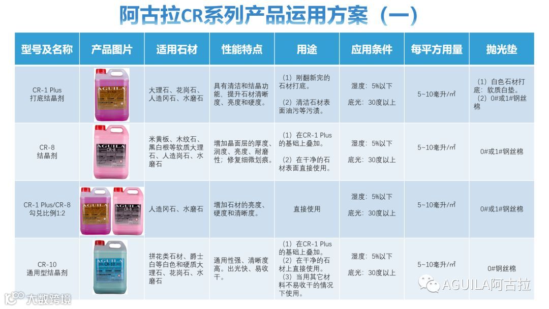 以上可见,影响石材结晶效果的因素是很多的,如何满足结晶所需要的施工条件,根据不同类型的石材和现场情况匹配产品,从而使石材达到最佳的结晶效果。以下是阿古拉结晶产品的运用方案,供大家参考。