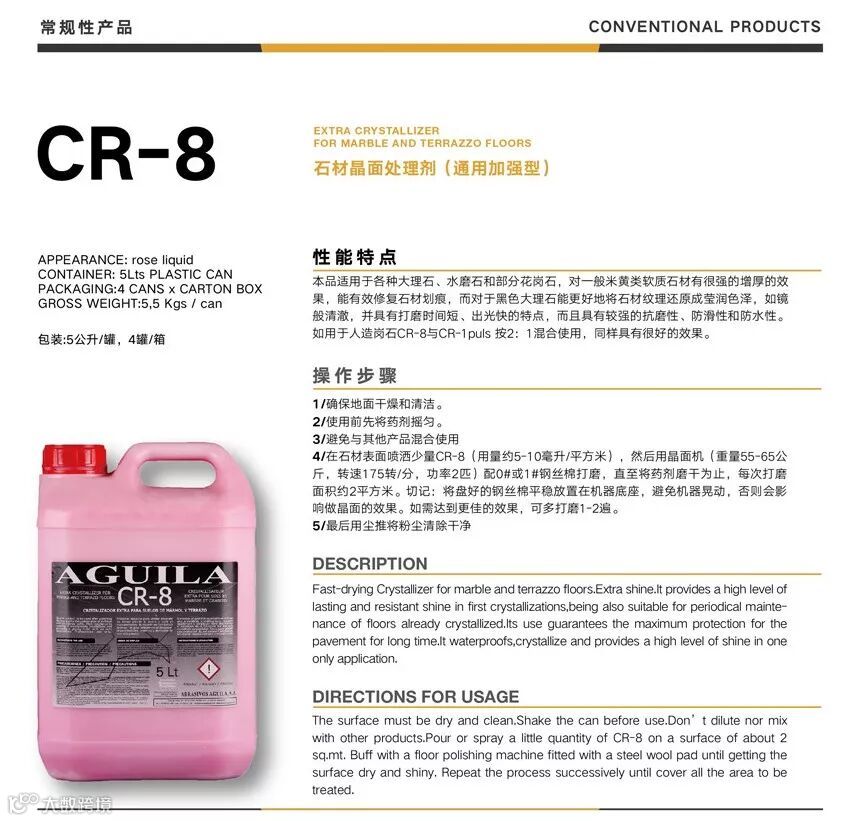 然后再用“CR-8石材结晶剂”进行叠加,以增加晶面层的润度和厚度感。