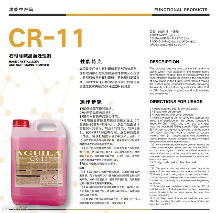 为了更好地呈现木纹石美丽的花纹图案,达到晶莹剔透的效果。我们建议首先使用“CR-11石材除碱结晶剂”打底。