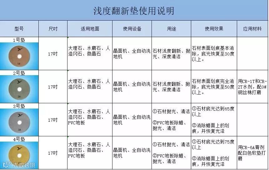 以往的工艺都是采用研磨片(4寸)打磨,石材翻新是一项技术性要求较高的工作,机器和磨片的选择、打磨的时间、研磨时走动的范围和路线都非常讲究。为了克服这个难题,阿古拉研发了一款产品“浅度翻新垫”(17寸),使石材翻新工作变得简单化了,大大提高了石材翻新的易操性,缩短了打磨时间,节省了人工成本。