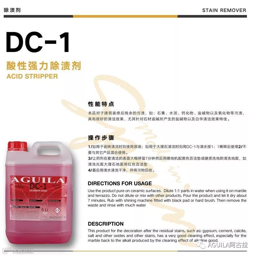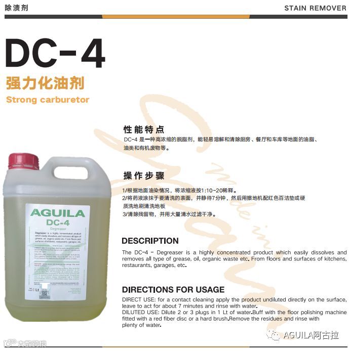 第三、日常清洁可以使用“DC-1 酸性强力除渍剂”(按1:3稀释)或“万能清洁剂”(弱碱性),用刷地机配洗地刷清洗地面。