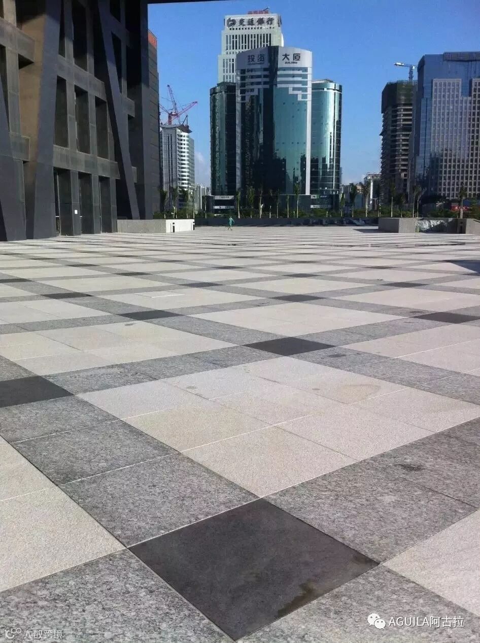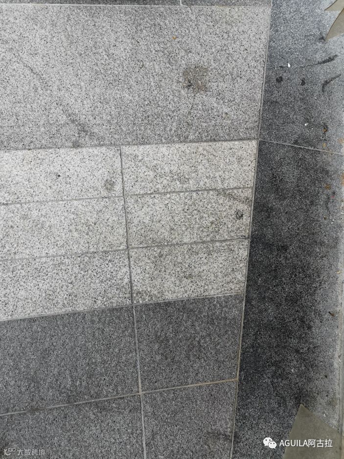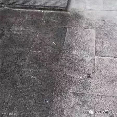 商场、酒店、医院、住宅小区等外围广场地面通常都会铺砌毛面石材,之所以采用毛面而非光面,主要是为了防滑,正是因为毛面石材开放性的孔隙,使之特别容易藏污纳垢,以至于地面污渍斑斑。