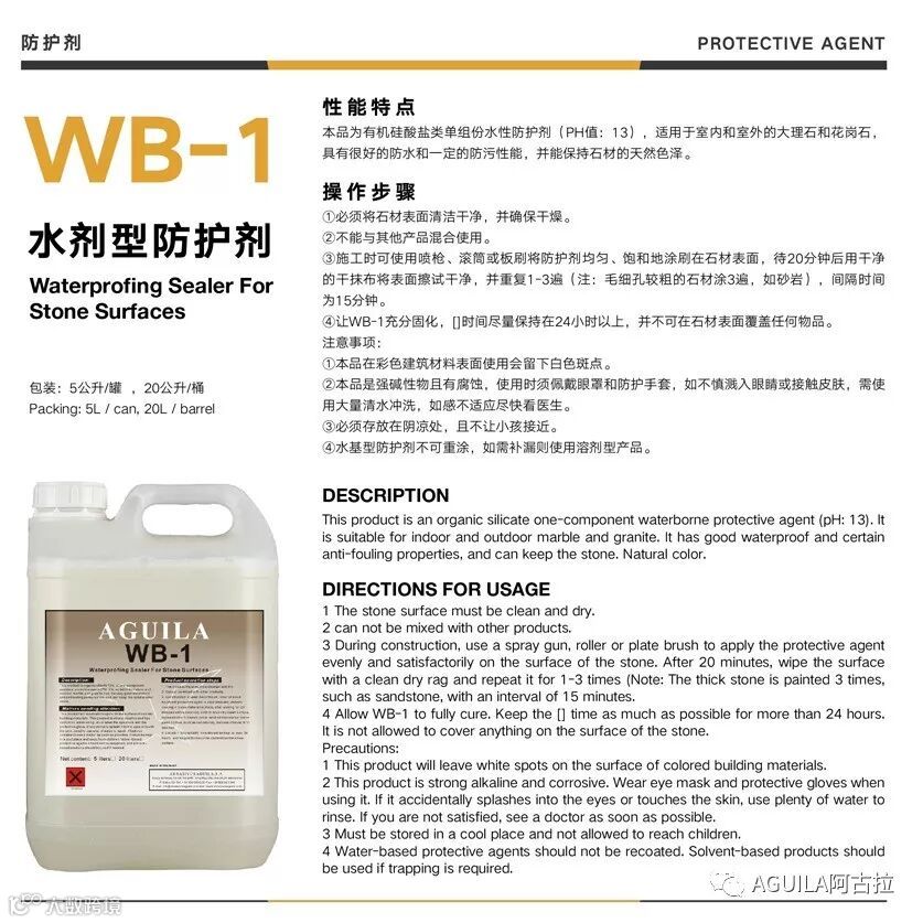 第二、待地面清洁干净并完全干燥后涂刷防护剂。先用“WB-1水剂型防护剂”打底,再用“SB-2毛面石材防护剂”罩面,这样做既可以节省材料费用,也可以达到防污的效果。