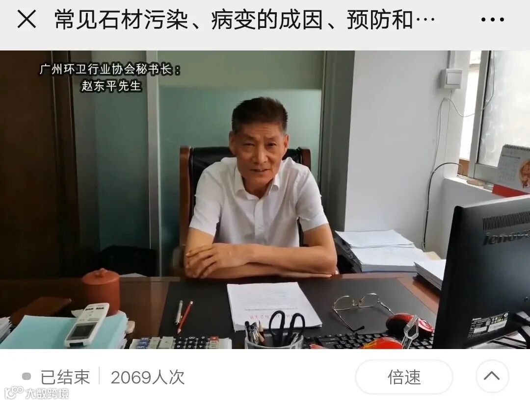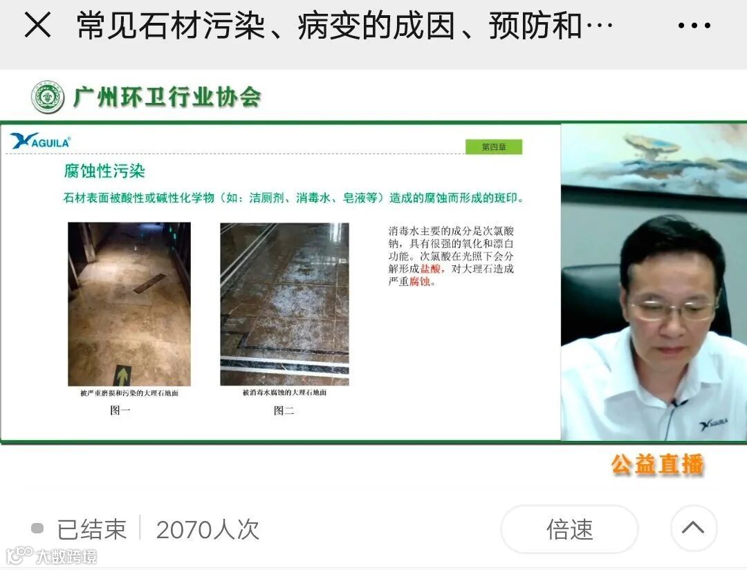 5月26日晚,我司与广州环卫行业协会联合推出的“石材护理公益直播课”观看人次达:2070,当晚的直播效果很不错,观众的学习热情很旺盛,相互分享现实工作中遇到的难题,陈俊杰老师在直播中为观众一一解答。