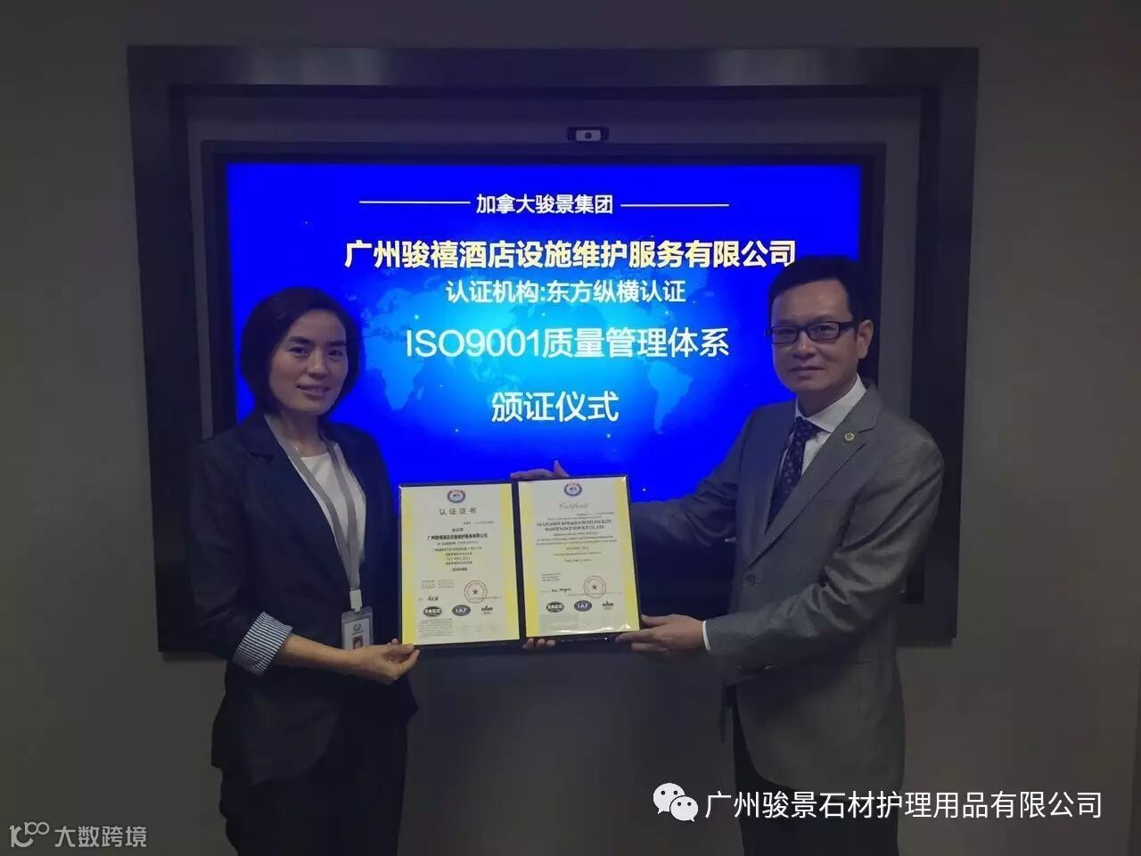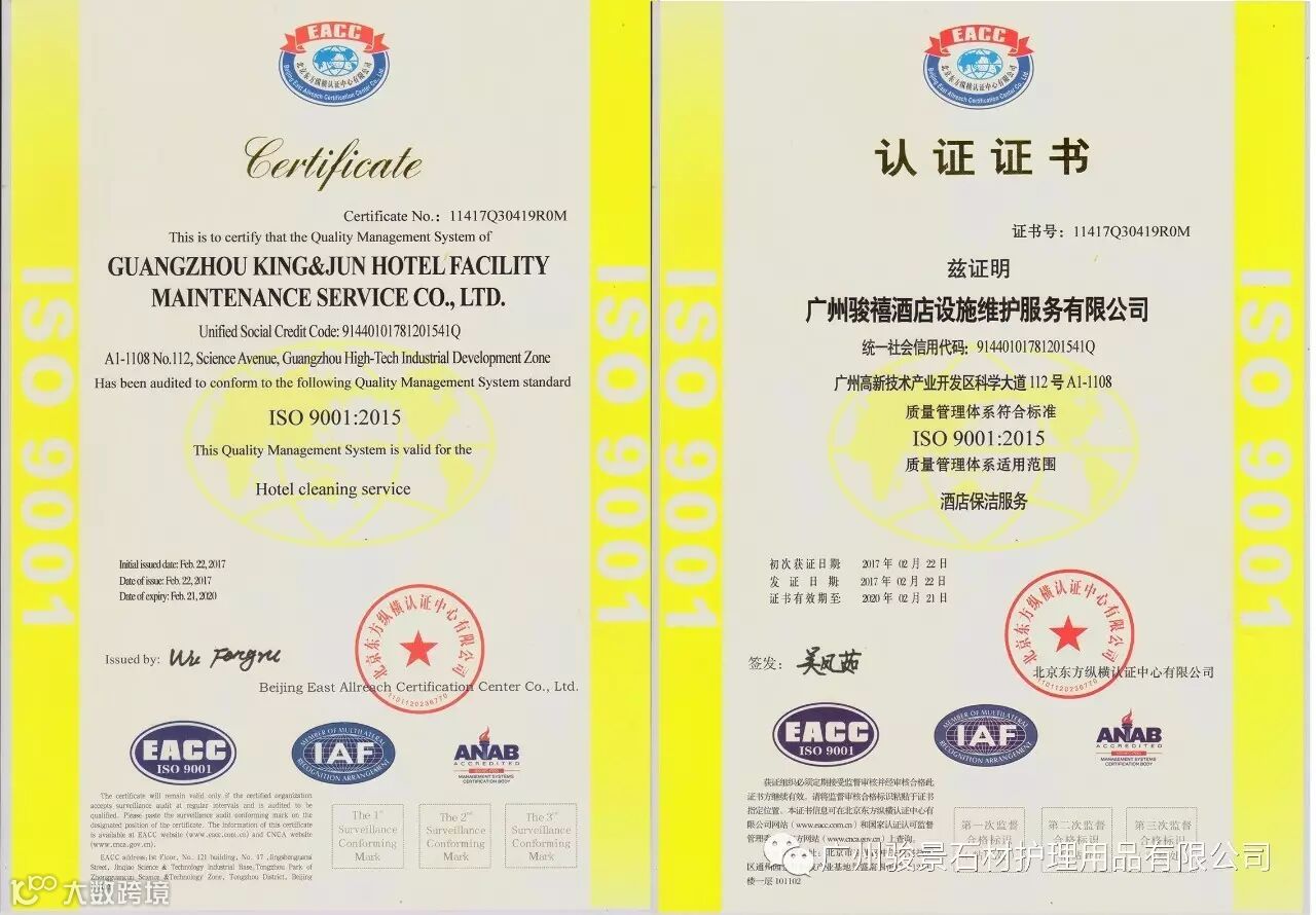 2017年3月6日,由广州骏禧酒店设施维护服务有限公司申报,广东东方纵横认证公司授理,国际标准化组织—美国质量学会(ANAB)正式向广州骏禧公司颁发ISO9001:2015《质量管理体系酒店保洁服务标准》证书。