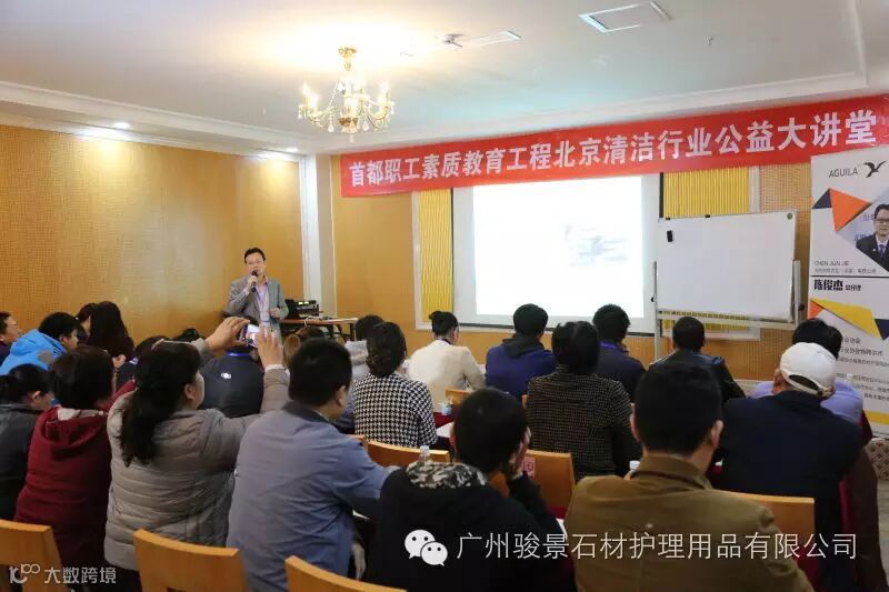 在交流会上,陈俊杰先生向北京市清洁行业协会会员单位和北京及周边区域酒店及物业保洁公司等有需求用户传播和交流科学的石材护理理念和方法,共同探讨先进的石材护理产品,以及前沿的石材护理技术和行业发展的新趋势、新模式和新方向,引导石材护理企业向专业化、规模化和多元化发展。