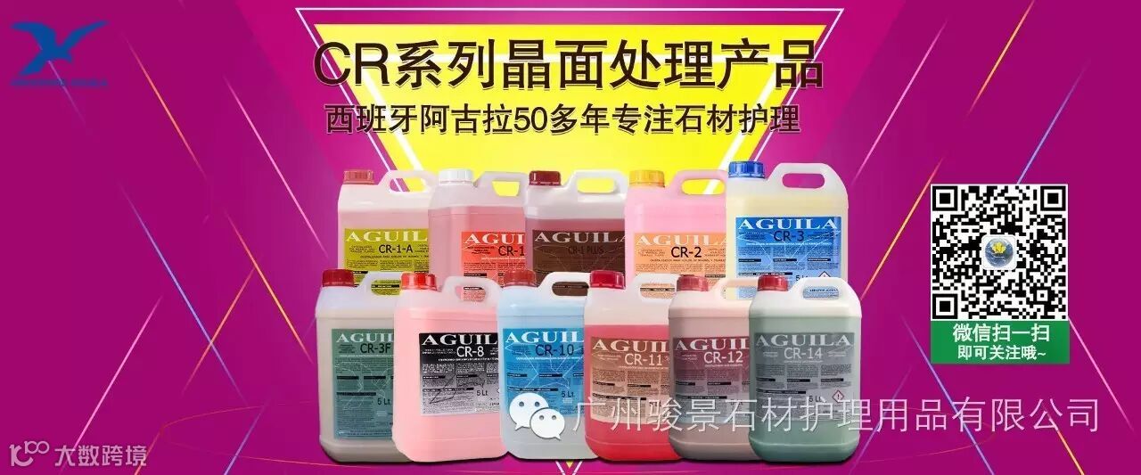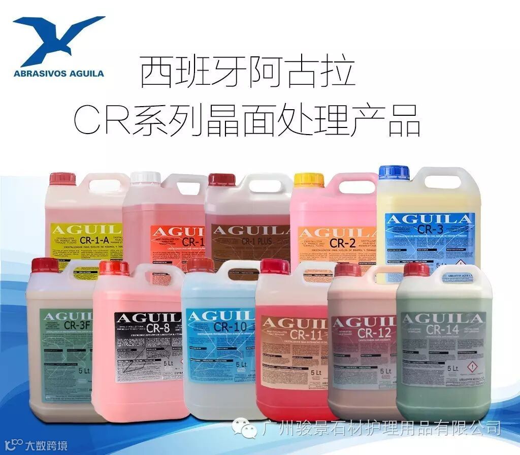 西班牙阿古拉化工公司凭借公司50年的生产历史,专门生产了AGUILA阿古拉CR系列石材晶面护理产品,是目前最理想的石材晶面保养产品,已经帮助众多业主解决了各种石材病变的困扰。本产品的特点是使用简单方便,打磨时间短,出光快,并且具有经济、节能、环保的优势,深受广大业主喜爱。