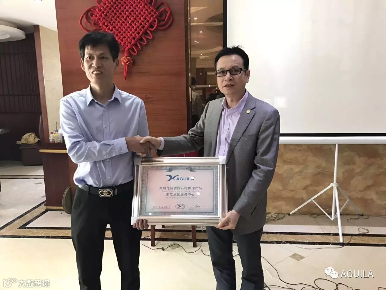 午餐过后,由西班牙阿古拉化工有限公司(大中华区)总经理陈俊杰先生向杭州宝丽洁清洗养护有限公司总经理严国尧先生进行“西班牙阿古拉石材护理产品浙江地区服务中心”授牌仪式。随着阿古拉浙江地区服务中心的成立,该地区的客户将得到更便捷、更优质的服务。