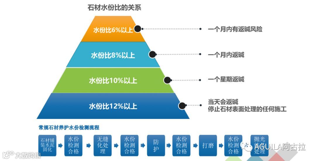 经过我们多年的研究,石材的湿度与施工和保养是密切相关的。湿度在5%以下,我们可以进行晶面处理;湿度在7%以下,我们可以进行防护处理。湿度在8%以下,我们可以进行除碱、除锈、除水斑等病变治理。