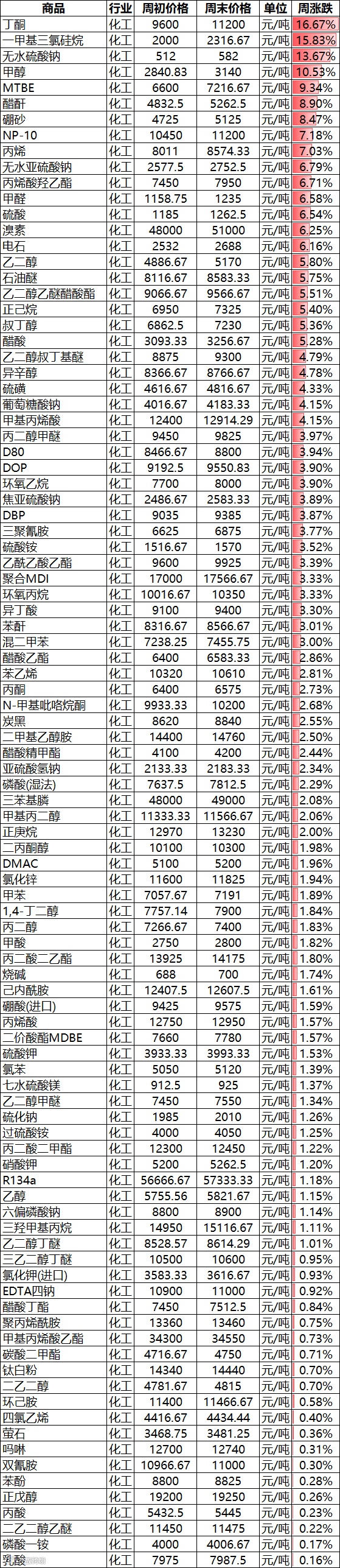 拉长周期来看,本轮化工原料涨价潮已持续多周,受国际原油价格高位震荡、地缘因素扰动影响,上周国内化工原材料整体仍维持上行态势,涨价范围持续扩大。数据显示,丁酮、一甲基三氯硅烷、无水硫酸钠、甲醇等上周度涨幅超过10%,不过相较于前一周,全行业涨价节奏略有放缓,市场疯涨势头开始出现松动迹象。