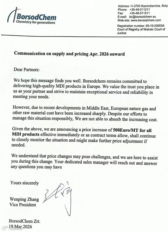 2026年3月19日,万华化学旗下匈牙利宝思德公司宣布,自4月起供应的所有MDI产品价格上调500欧元/吨(折合人民币3982元/吨),调价立即生效或按合同条款允许时间执行。