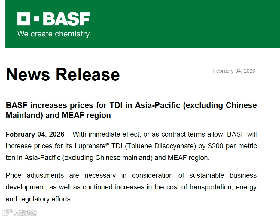 巴斯夫此次提价,既是对自身成本的覆盖,也为全球TDI价格定下新基准,