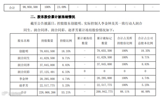 公告显示,控股股东创能明持有公司股份78,655,500股,实际控制人李金钟持有20,295,000股,分别占公司总股本的18.35%和4.74%。本次被轮候冻结的股份数量均占其各自持有公司股份的100%。此外,包括一致行动人在内,控股股东方面合计持有公司股份约2.28亿股,其中累计被冻结数量约为2.01亿股,占其持股总数的88.11%,占公司总股本的46.88%。