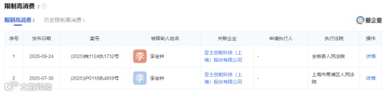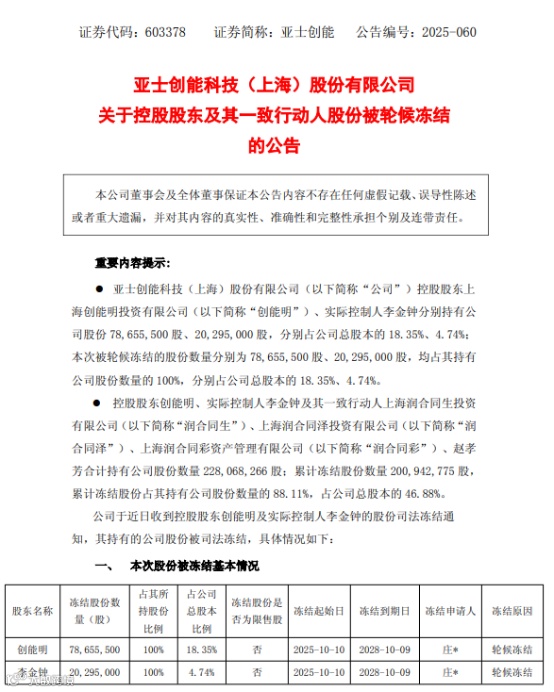 亚士创能10月14日公告称,公司控股股东上海创能明投资有限公司及实际控制人李金钟所持有的全部公司股份被轮候冻结。