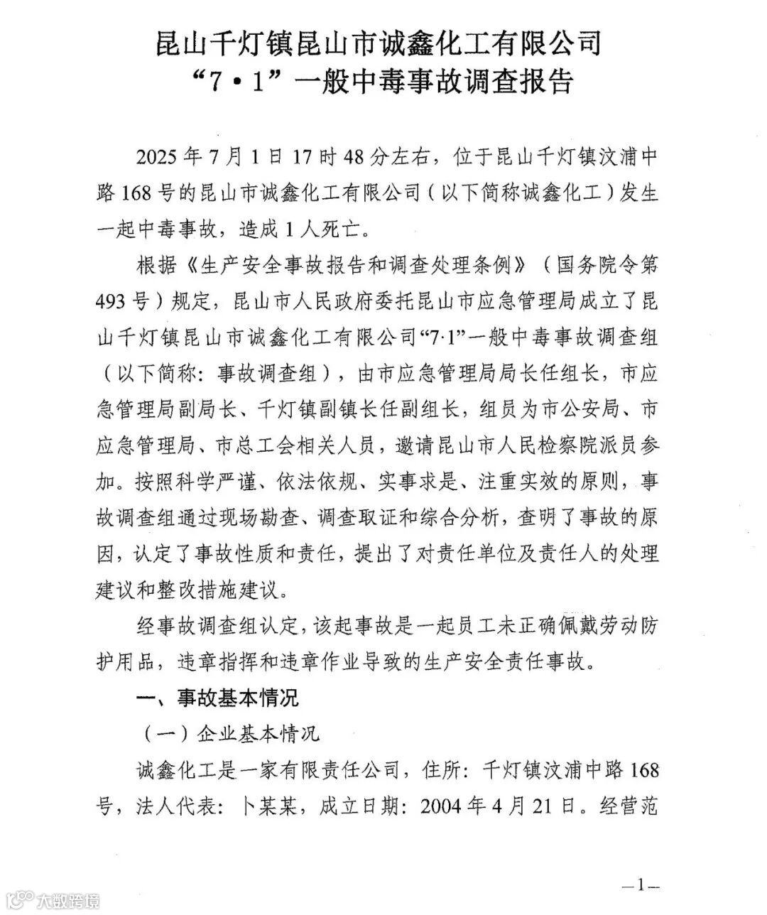 2025年7月1日17时48分左右,位于昆山千灯镇汶浦中路168号的昆山市诚鑫化工有限公司发生一起中毒事故,造成1人死亡。