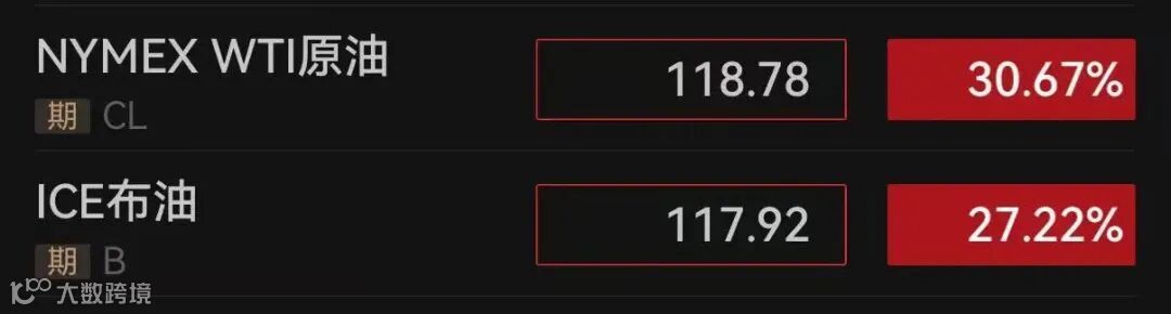 今日,WTI原油期货暴涨超30%,报118.7美元/桶,为2022年6月以来新高;布伦特原油期货价格涨幅扩大至27%,最高报117.9美元/桶。