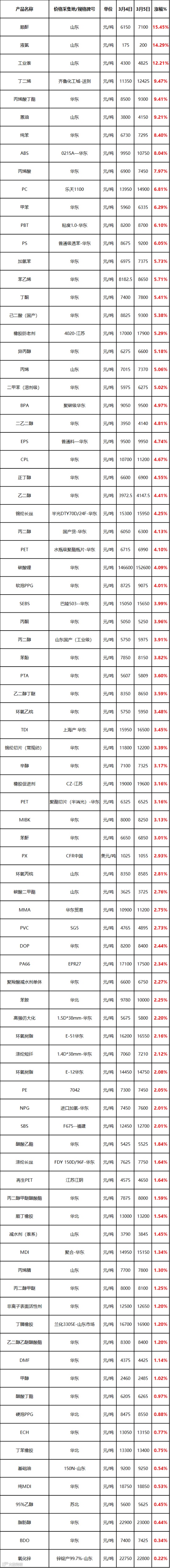近期受中东地缘冲突持续发酵、国际原油大幅走高影响,国内化工原料市场迎来成本驱动型普涨,苯酚、丙酮、双酚 A、环氧氯丙烷等核心上游原料涨幅突出,部分原材料价格出现一单一价、一天一价、排队拿货的情况,丁酮、环己酮、丙烯酸乳液及大化工产品同步跟涨,工厂挺价、封盘惜售现象普遍,下游刚需跟进、观望情绪浓厚,产业链整体呈现“上游强涨、下游慢接” 的格局。