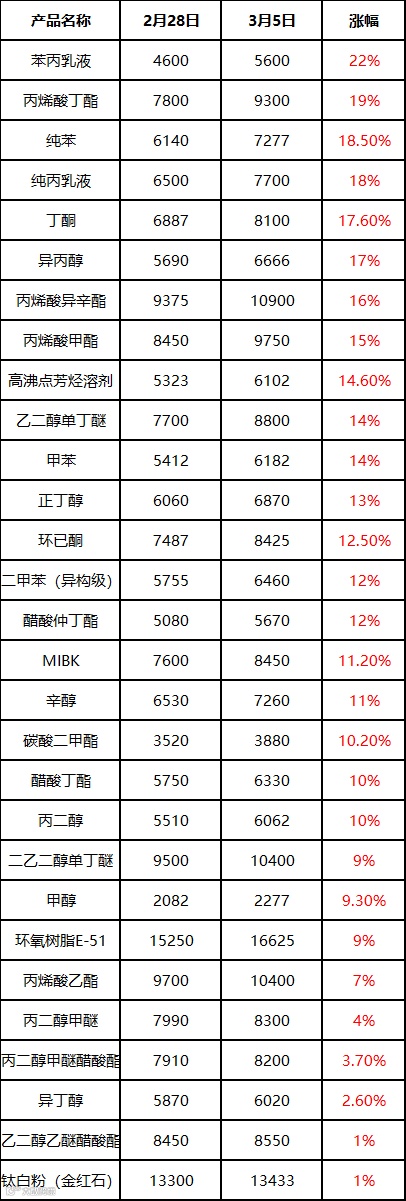 截至3月5日,江苏丙酮市场收于5100-5400元/吨,较2月26日上涨585元/吨,涨幅12.54%;本周均价4892元/吨,环比上涨232元/吨,涨幅4.97%。