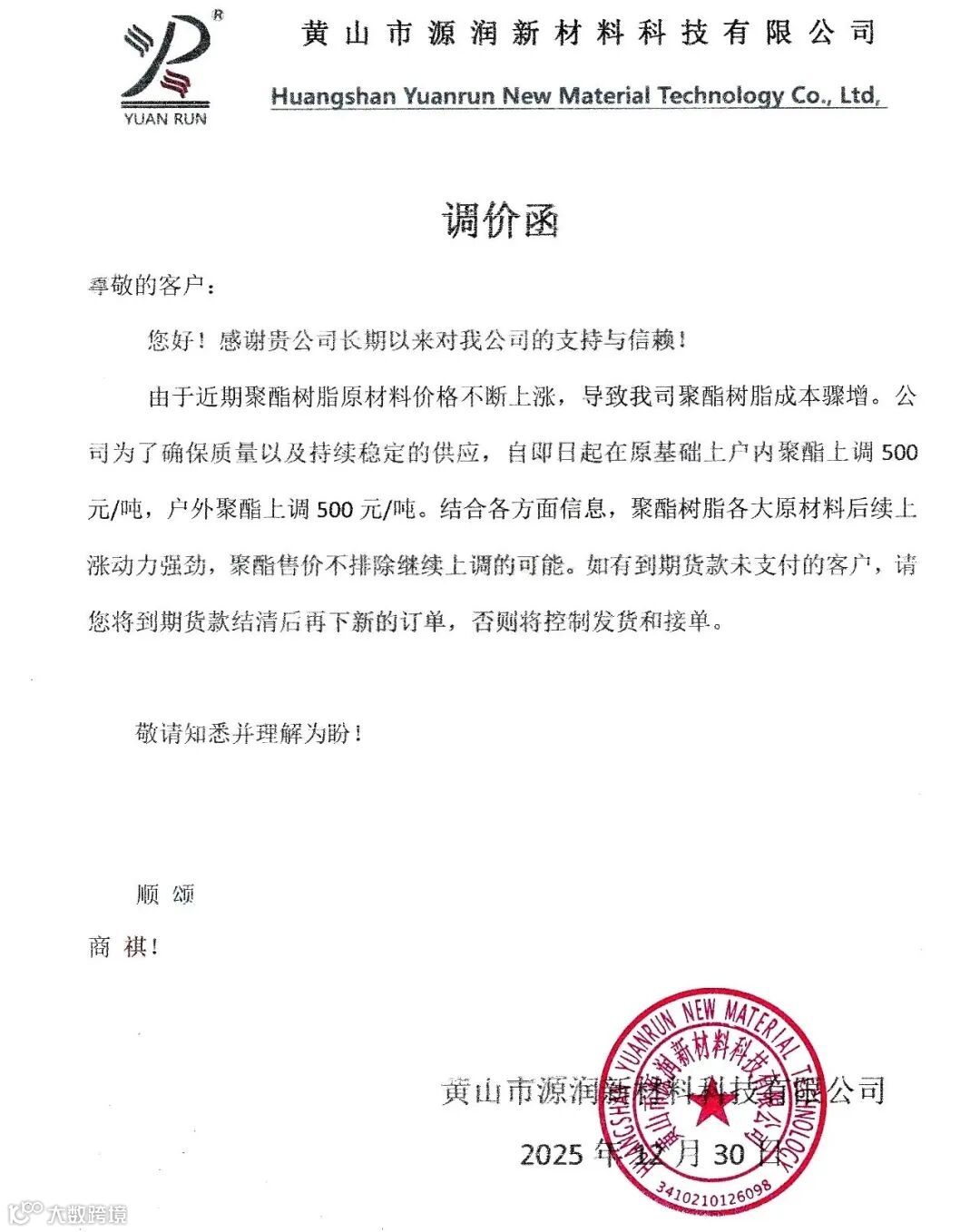 黄山市向荣新材料也发布涨价函,称由于近期聚酯树脂原材料价格不断暴涨,导致产品生产成本骤然巨增,自即日起在原基础上户内聚酯上调500元/吨,户外聚酯上调500元/吨。其同时也提到了“不排除后期还有上涨可能”,并提醒到期货款未支付的客户,将到期货款结清后再下新的订单。