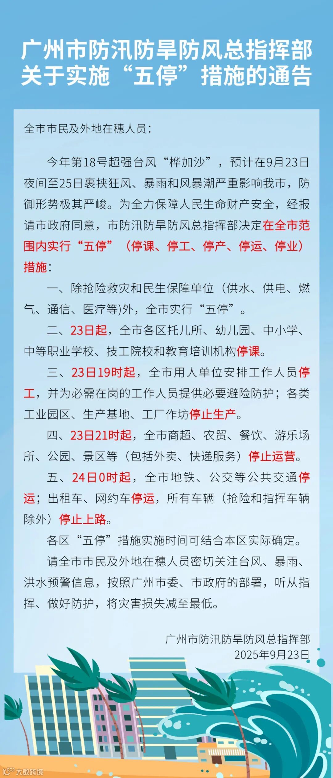 9月23日,广州市防汛防旱防风总指挥部发布关于实施“五停”措施的通告,为全力保障人民生命财产安全,经报请市政府同意,市防汛防旱防风总指挥部决定在全市范围内实行“五停”(停课、停工、停产、停运、停业)措施。