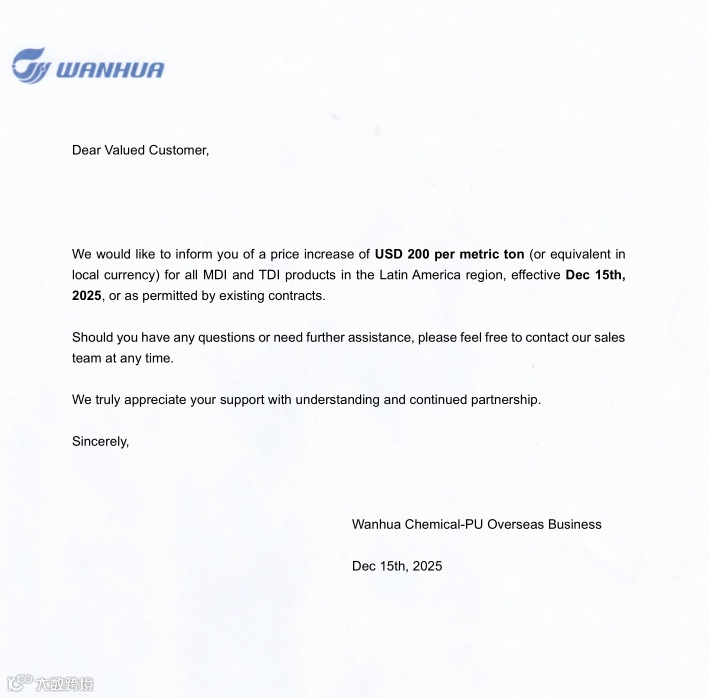 近日,12月以来MDI市场涨势不断,全球主要的生产商陶氏化学、万华化学、巴斯夫、亨斯迈等四大行业巨头密集发布调价公告,涨幅从200-350美元/吨不等,覆盖东南亚、南亚、欧洲、中东、非洲、等核心市场,涉及区域消费量占全球75%,挺价意图明确。