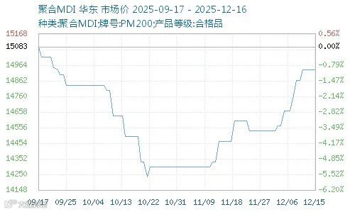 在国内市场,近期聚合MDI市场正在低位反弹,从上月低点14300元/吨,到12月16日的14860元/吨左右,涨幅约560元/吨。价格反弹的同时,市场心态也在逐渐获得修复。