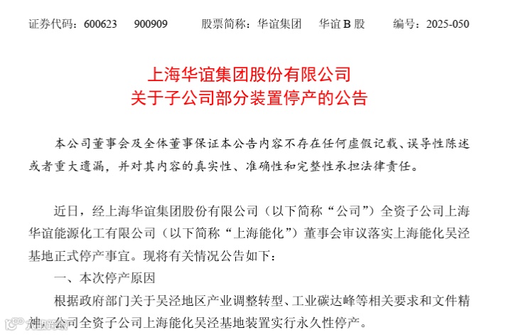 9月12日,华谊集团(600623)公告,全资子公司上海华谊能源化工有限公司(简称“上海能化”)吴泾基地装置实行永久性停产。