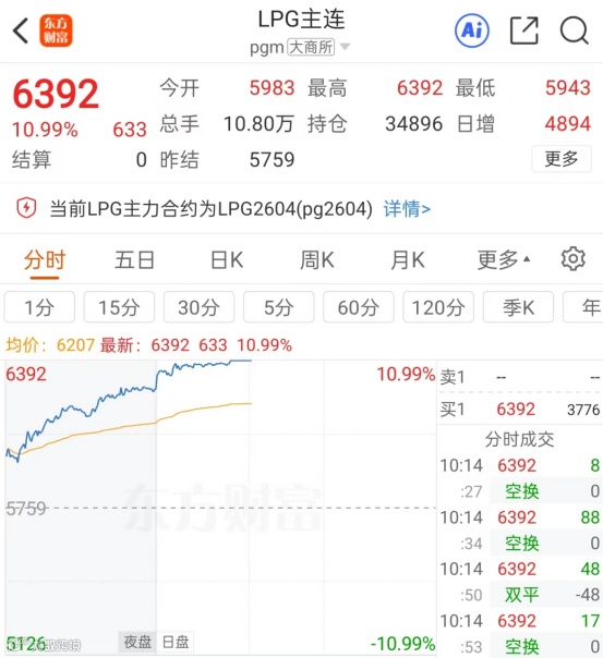 中东冲突持续升级,中东能源供应风险加剧,3月19日布伦特原油涨幅扩大至5%,液化石油气(LPG)主力合约触及涨停,涨幅10.99%,报6392元/吨。