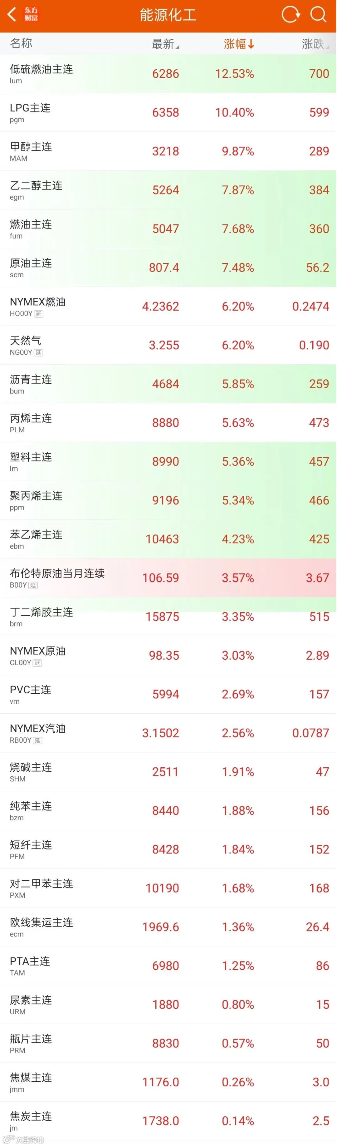 国内能源化工板块,低硫燃料油(LU)主力合约日内暴涨14%、LPG主连期货价格涨幅超过10%,甲醇、乙二醇、燃油、原油、NYMEX燃油、天然气、沥青、丙烯、塑料、聚丙烯等期货盘内涨幅超过5%。