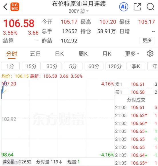受冲突事件升级影响,3月19日,布伦特原油当月连续涨幅扩大至超3%,盘内最高报107.20美元/桶。此外,美国天然气期货涨超6%,现报3.258美元/百万英热。