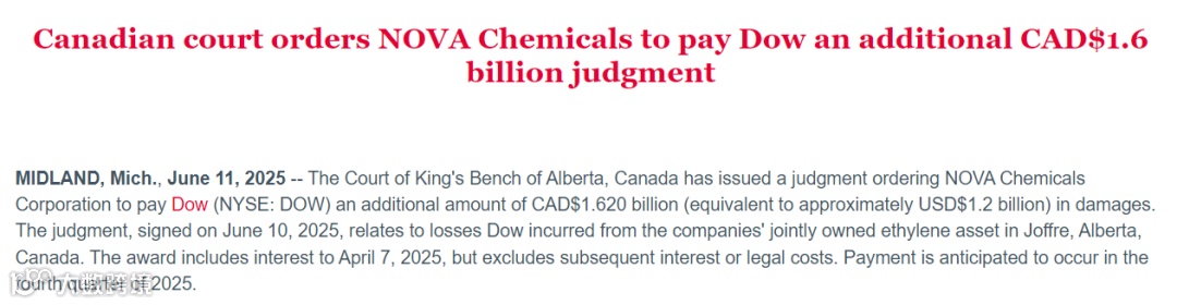 6月11日,陶氏官网消息:加拿大阿尔伯塔省王座法庭已裁定诺瓦化学公司(NOVA Chemicals) 向陶氏化学(Dow)额外支付16.2亿加元(约合人民币85.3亿)损害赔偿金。该判决于2025年6月10日签署,该赔偿涵盖截至2025年4月7日的利息,但不含后续利息及诉讼费用,预计将于2025年第四季度支付。