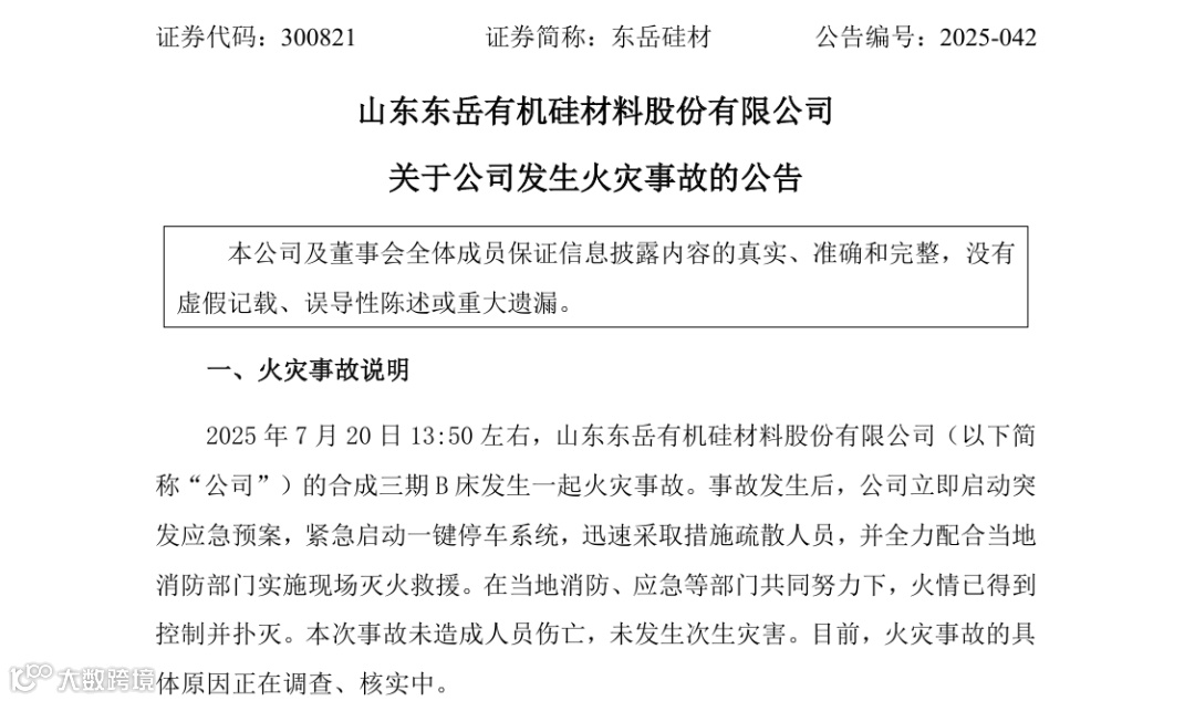 7月21日,东岳公告称2025 年7月20日13:50左右,该公司的合成三期B床发生一起火灾事故。事故发生后,公司立即启动突发应急预案,紧急启动一键停车系统,迅速采取措施疏散人员,并全力配合当地消防部门实施现场灭火救援。在当地消防、应急等部门共同努力下,火情已得到控制并扑灭。本次事故未造成人员伤亡,未发生次生灾害。目前,火灾事故的具体原因正在调查、核实中。
