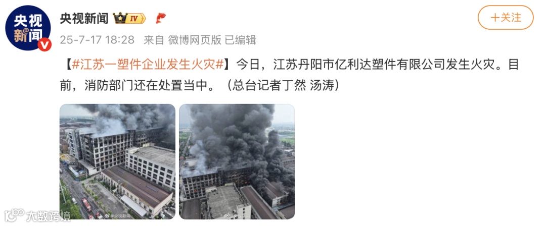 今日,江苏丹阳市亿利达塑件有限公司发生火灾。目前,消防部门还在处置当中。