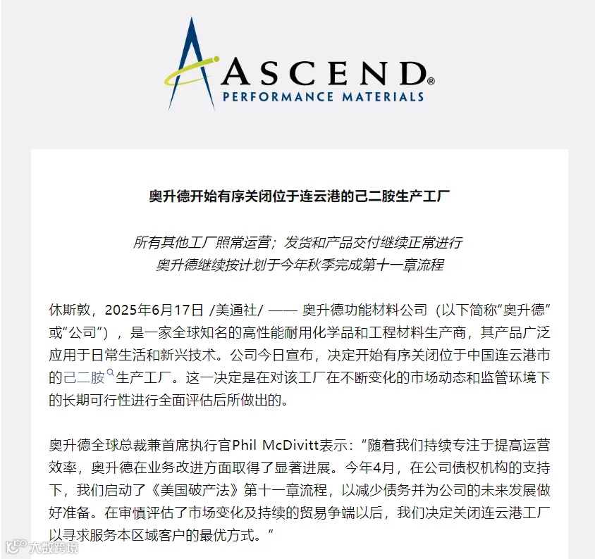 近日,美国尼龙巨头奥升德宣布,计划未来几个月内有序关闭位于中国连云港市的己二胺生产工厂。