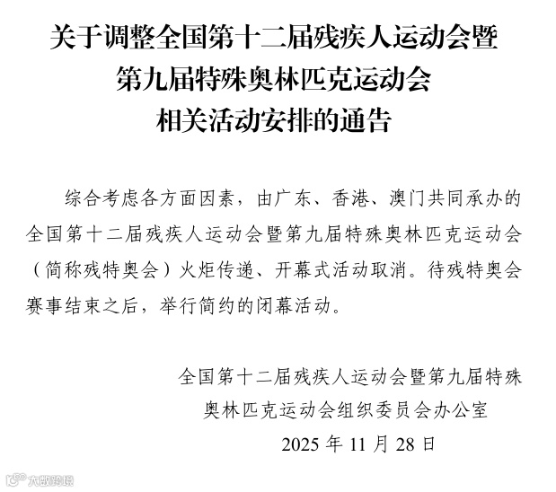 全国第十二届残疾人运动会暨第九届特殊奥林匹克运动会火炬传递、开幕式活动取消