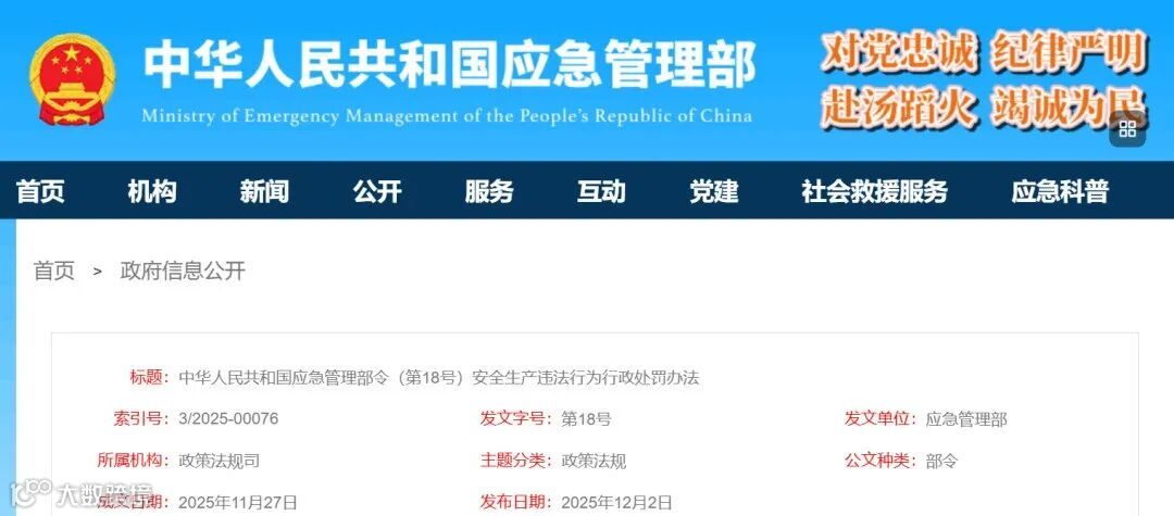 《安全生产违法行为行政处罚办法》已经2025年11月24日应急管理部第29次部务会议审议通过,现予公布,自2026年2月1日起施行。