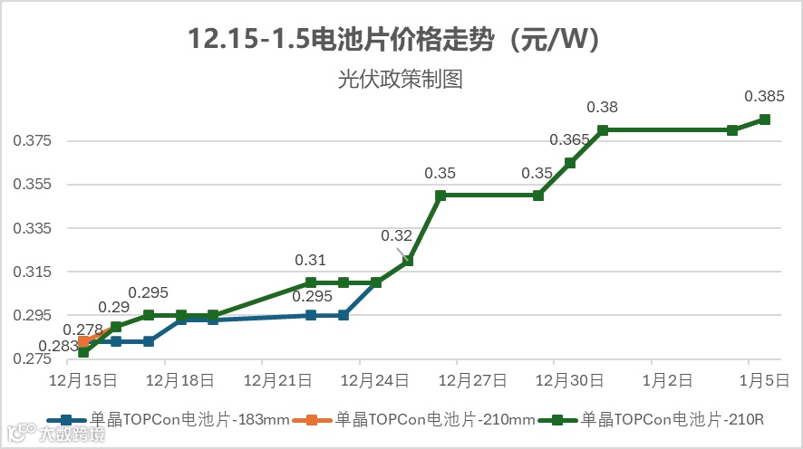 电池片价格同步大涨,2025年12月中下旬以来TOPCon电池片涨幅最大达到40%,12月下旬中国主流电池片价格升至0.31–0.33元/W,环比一周大涨约10.3%。组件端,隆基、晶澳两大龙头同步上调报价,隆基部分产品涨2-4分/瓦,晶澳全线上调3-4分/瓦。