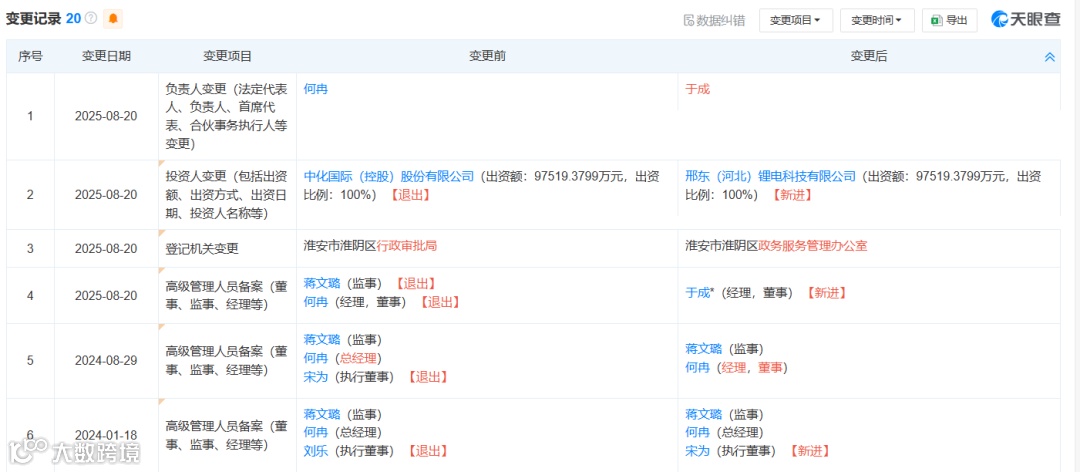 就在半年报披露前夕,8月20日,工商信息显示,中化国际原控股子公司骏盛新能源完成投资人变更,股东由中化国际正式变更为邢东(河北)锂电科技有限公司,标志着这家曾承载中化国际新能源布局的企业,正式脱离其体系。