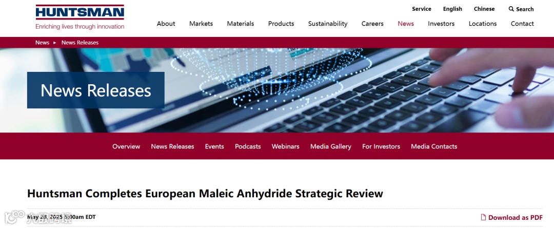 5月28日,亨斯迈集团宣布,已完成对其欧洲马来酸酐业务的战略评估。评估结果显示,公司将关闭位于德国默尔斯(Moers)的马来酸酐工厂。预计默尔斯工厂的关闭工作将于本季度末完成。