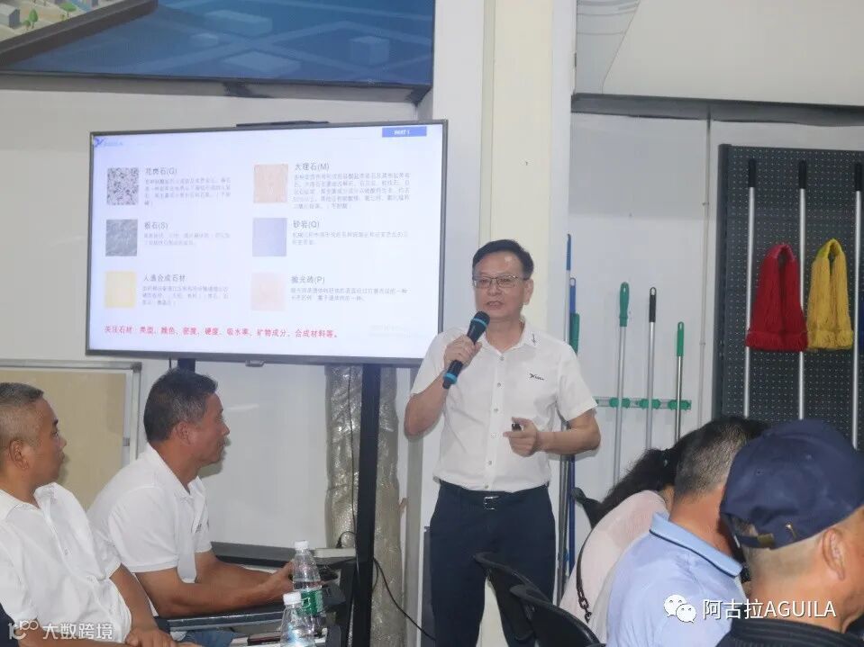 陈老师以他将近30年的从业经历和积累,向学员们传授石材护理知识,通过案例分析石材的病变和污染问题,提供了具体的预防和解决方案,并向大家介绍了阿古拉最新研发的产品,帮助大家突破技术瓶颈,提高工作效率,从而实现降本增效的目标。课堂上学员们与陈老师积极互动,学习气氛热烈。