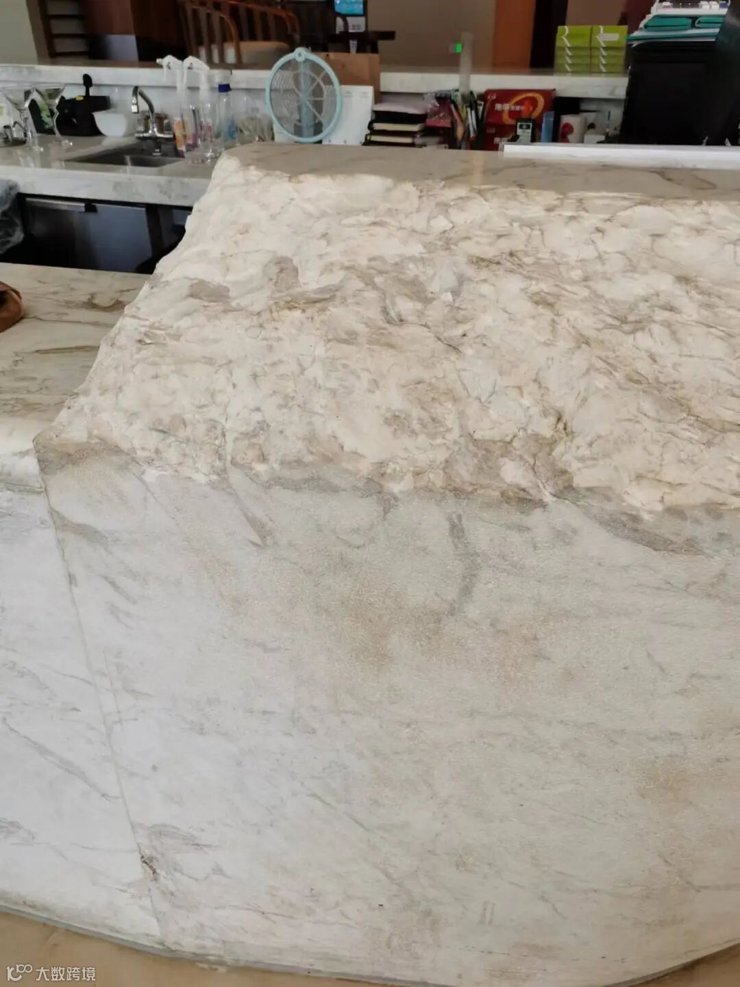 这是一家星级酒店的吧台,用的是雅士白大理石,侧面还做了一个自然面的特别造型。本来白色石材就不耐脏,用来做吧台肯定不妥,何况还弄成自然面,那就更容易脏了。显然现在图片上的雅士白已经很脏,尤其是自然面的地方,这样的设计反而是弄巧成拙。
