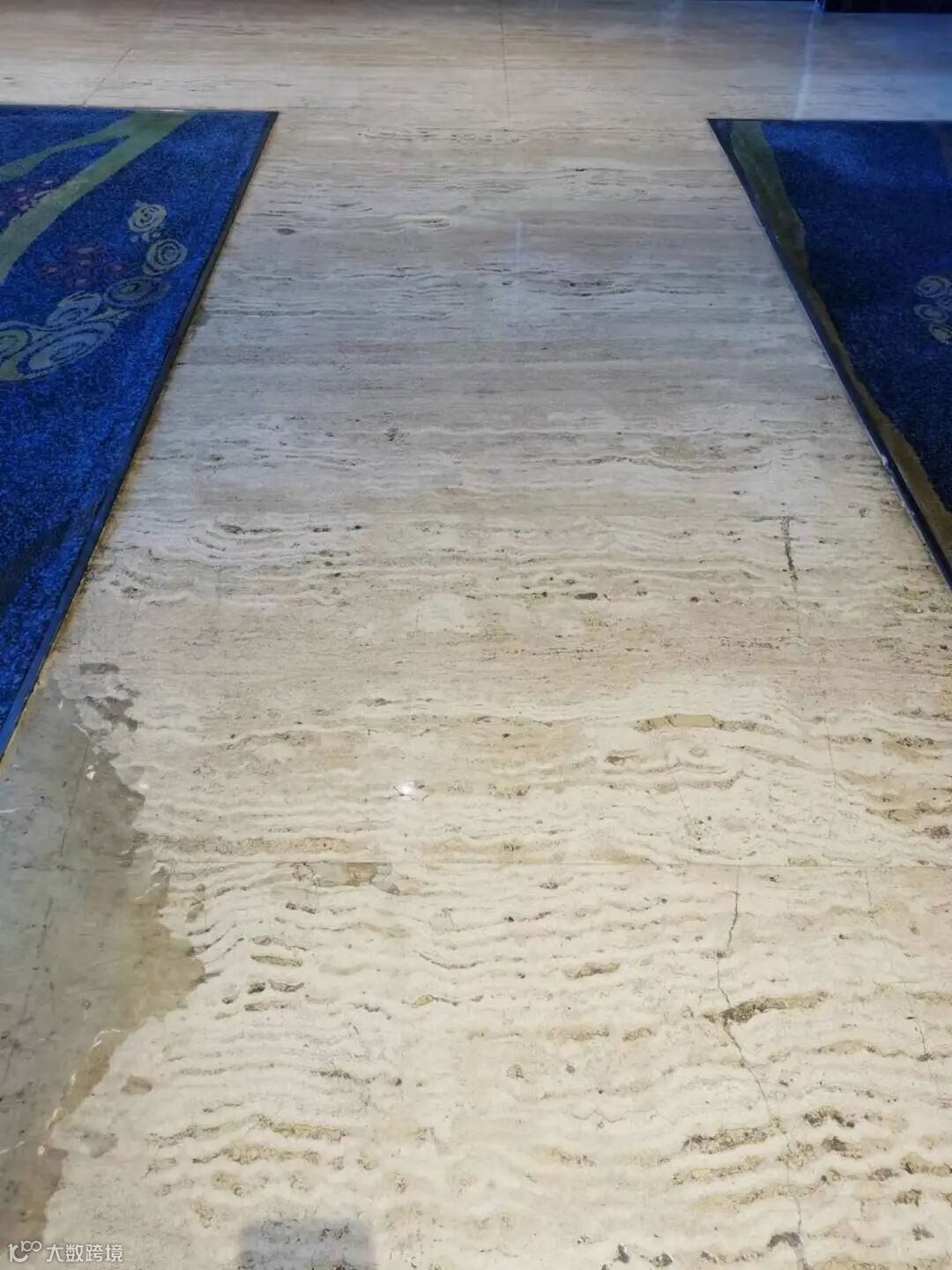 这是一家五星级酒店的石材地面,是用洞石来铺贴的。洞石有自然、古朴、典雅之美,深受设计师的青睐,大多用于墙面装饰。但洞石也有多孔、疏松和易破损的特点,如果铺在地面上,一定要做刮胶补胶处理,否则脏东西就很容易渗入到石材里面。