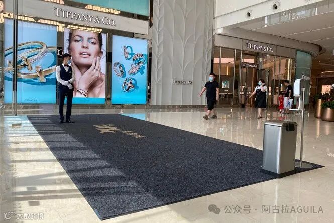第一,在商场的门口、主通道、卫生间出入口等位置辅设各种功能性的地垫,每逢雪雨天在门内再加设吸水地垫,以防止石材被刮伤和污染。
